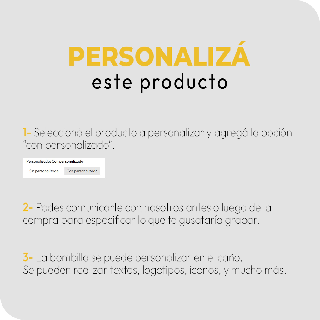 ¡Este producto se puede personalizar! Podes grabar el bombillón en el caño. Podes comunicarte con nosotros antes o luego de la compra para especificar lo que te gustaría grabar.