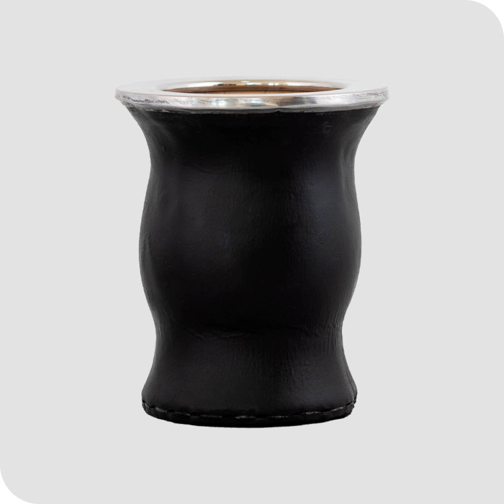 Mate de producción uruguaya, tipo camionero copa con virola lisa de acero. El mismo es forrado en cuero y su interior es de calabaza.