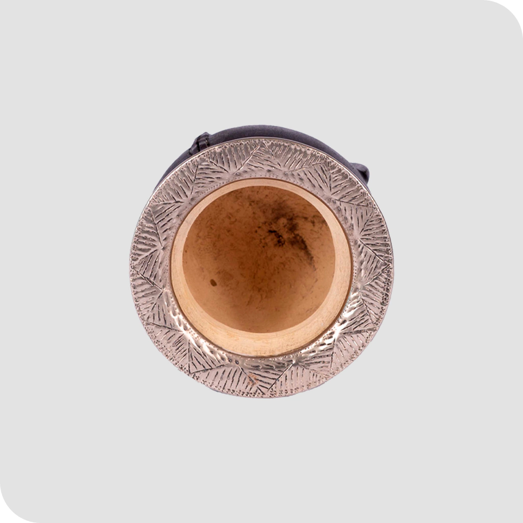 Mate de producción uruguaya, tipo camionero con virola cincelada de alpaca. El mismo es forrado en cuero y su interior es de calabaza.