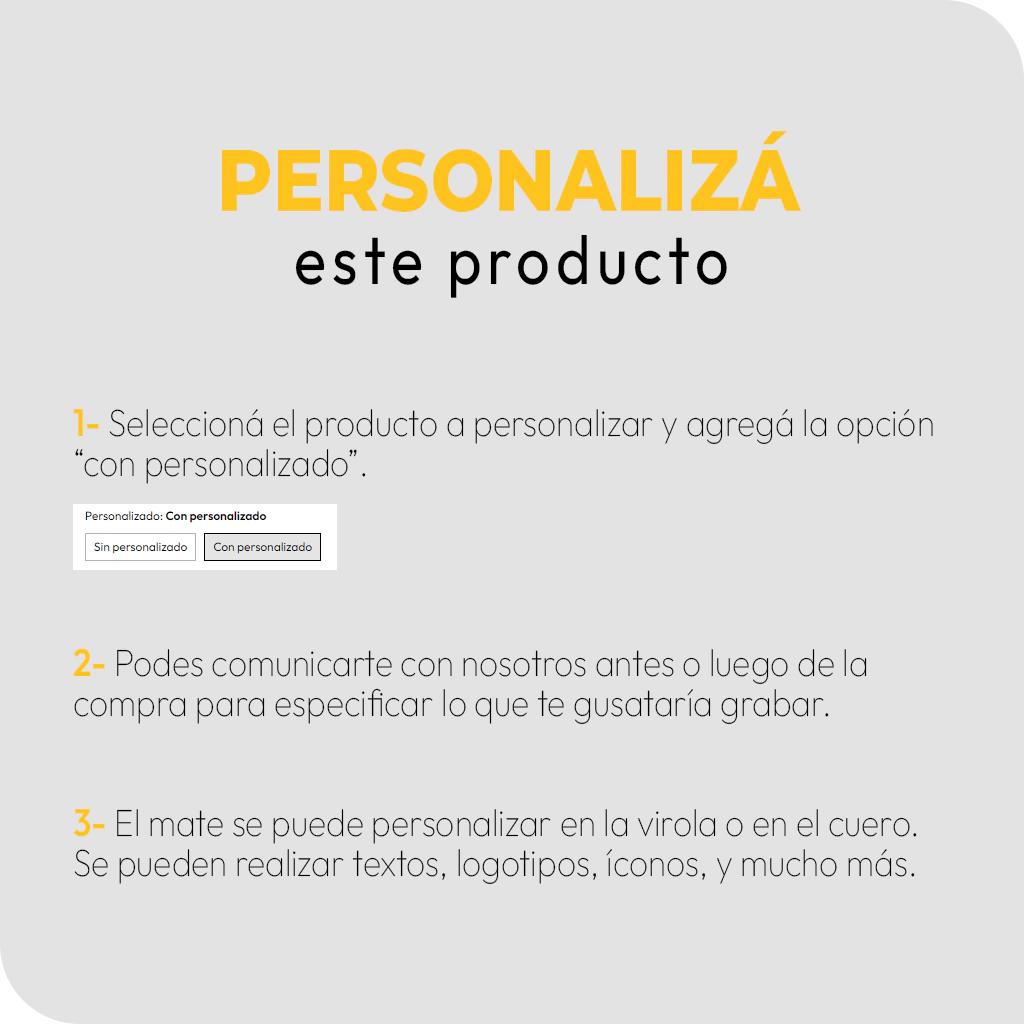 ¡Este producto se puede personalizar! Podes grabar el mate en la virola o en el cuero. Podes comunicarte con nosotros antes o luego de la compra para especificar lo que te gustaría grabar.
