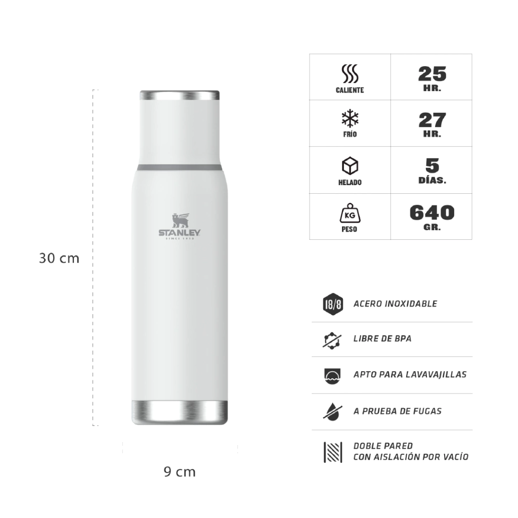 Mantiene la temperatura 25 horas caliente, 27 horas frío y 5 días helado. Dimensiones: 30 x 9cm.