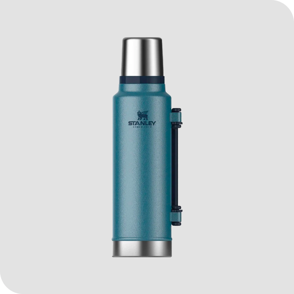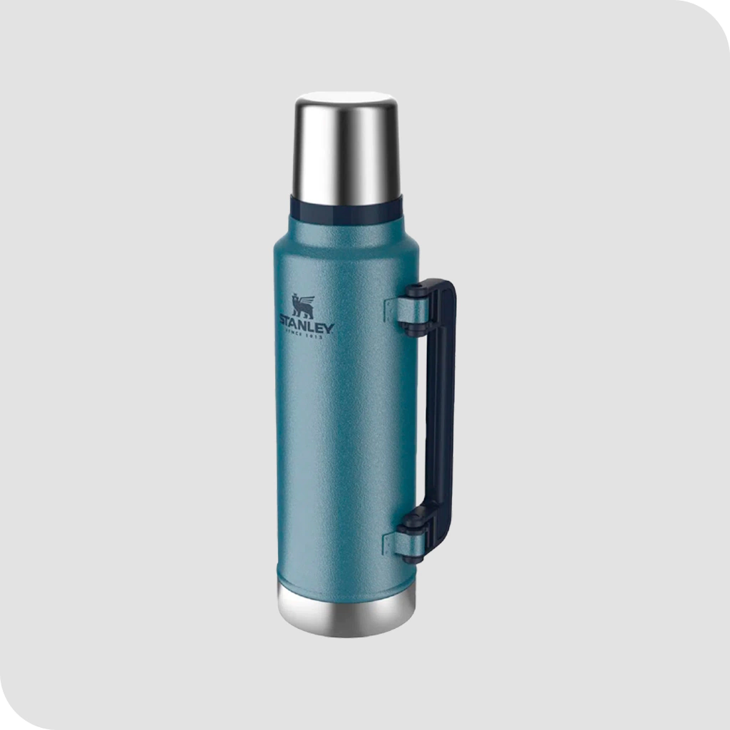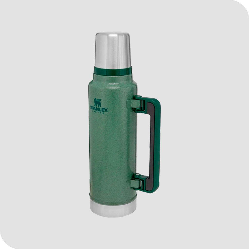Termo STANLEY Classic, su capacidad es de 1.4 litros, con manija plegable y pico cebador.