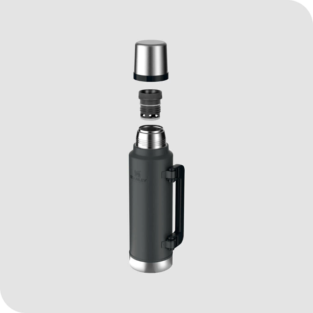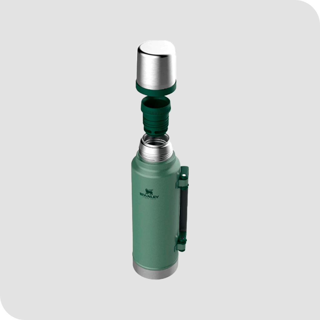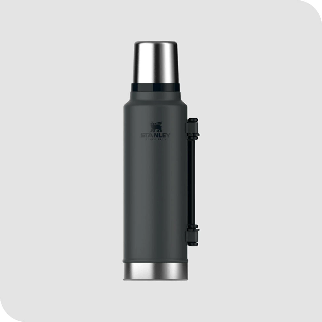 Termo STANLEY Classic, su capacidad es de 1.4 litros, con manija plegable y pico cebador.