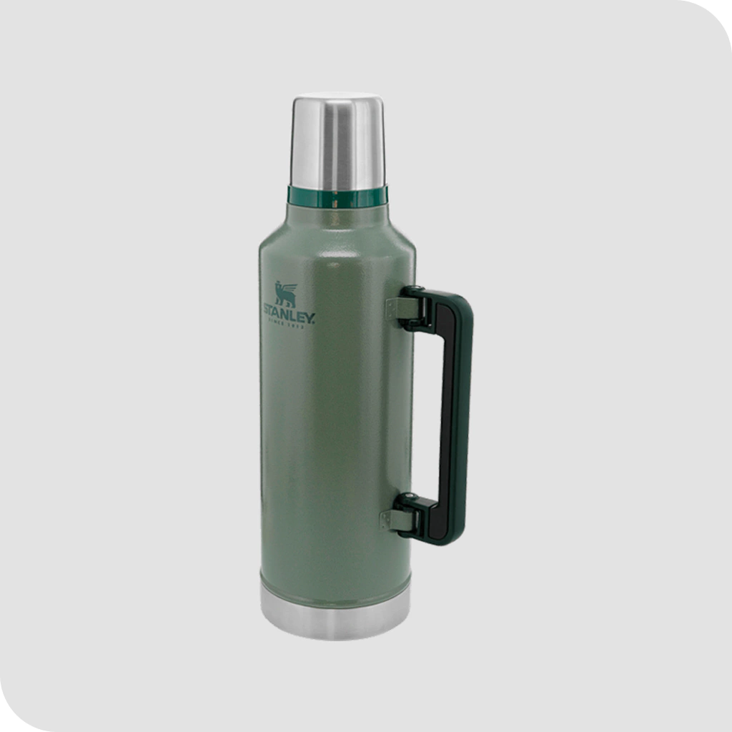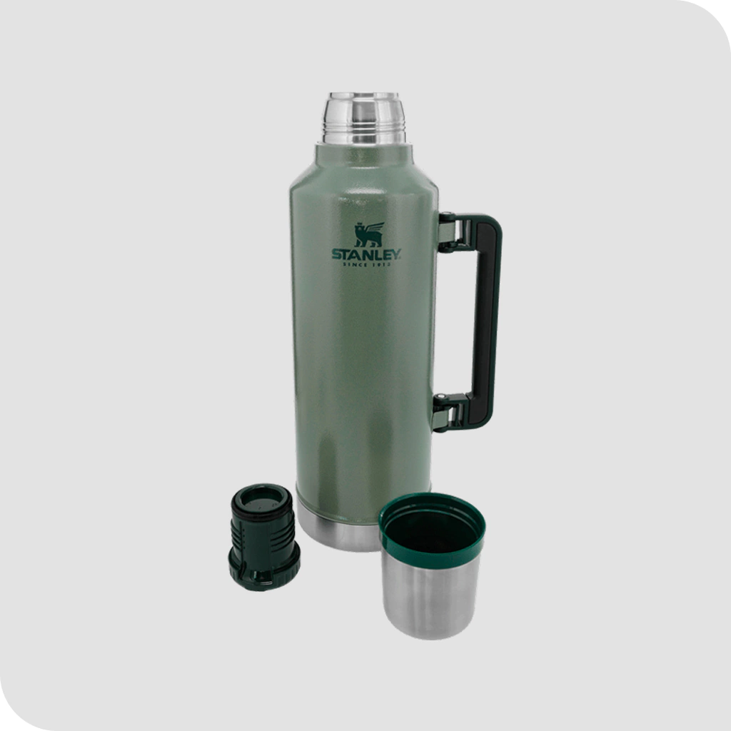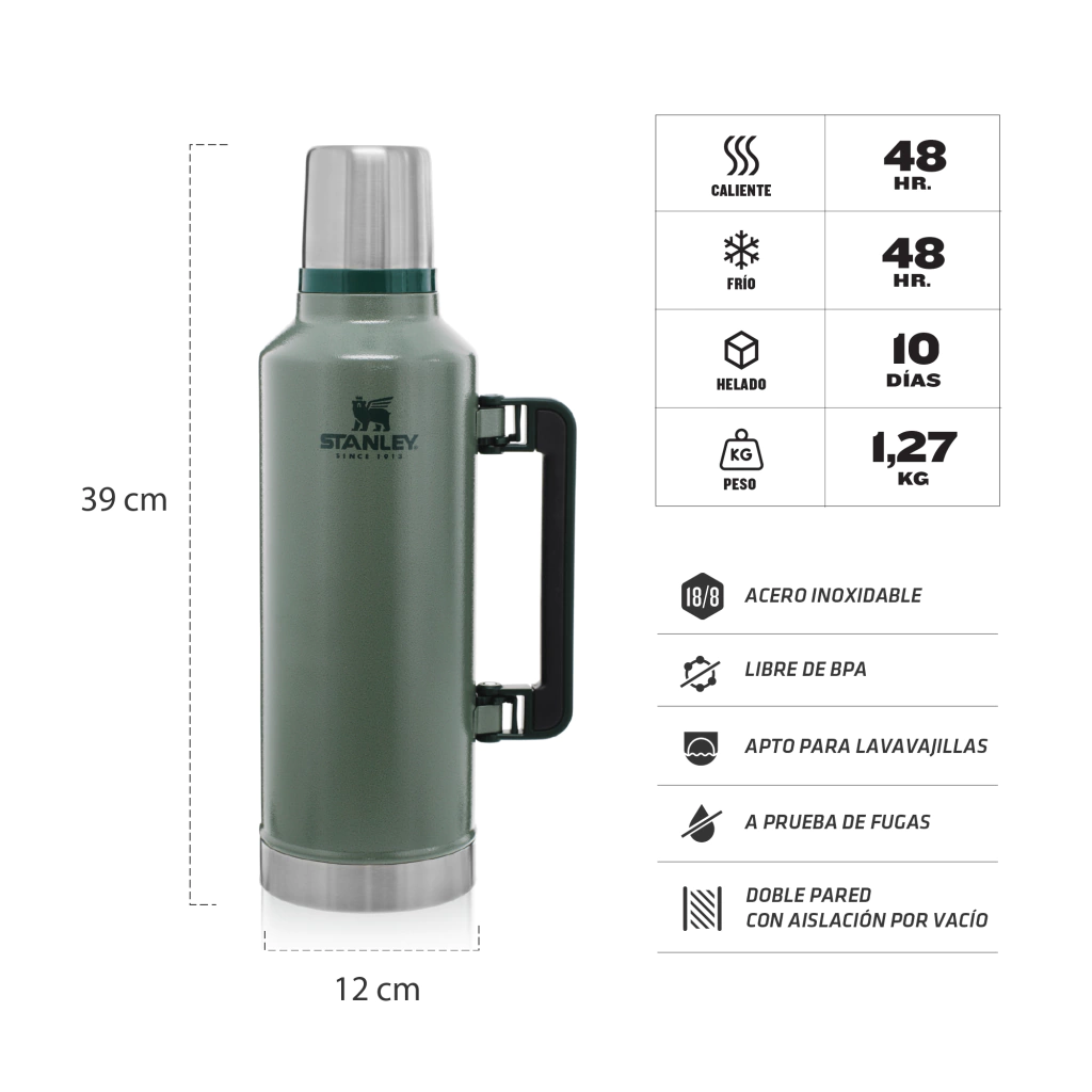 Termo STANLEY Classic, su capacidad es de 2.3 litros, con manija plegable y pico cebador.