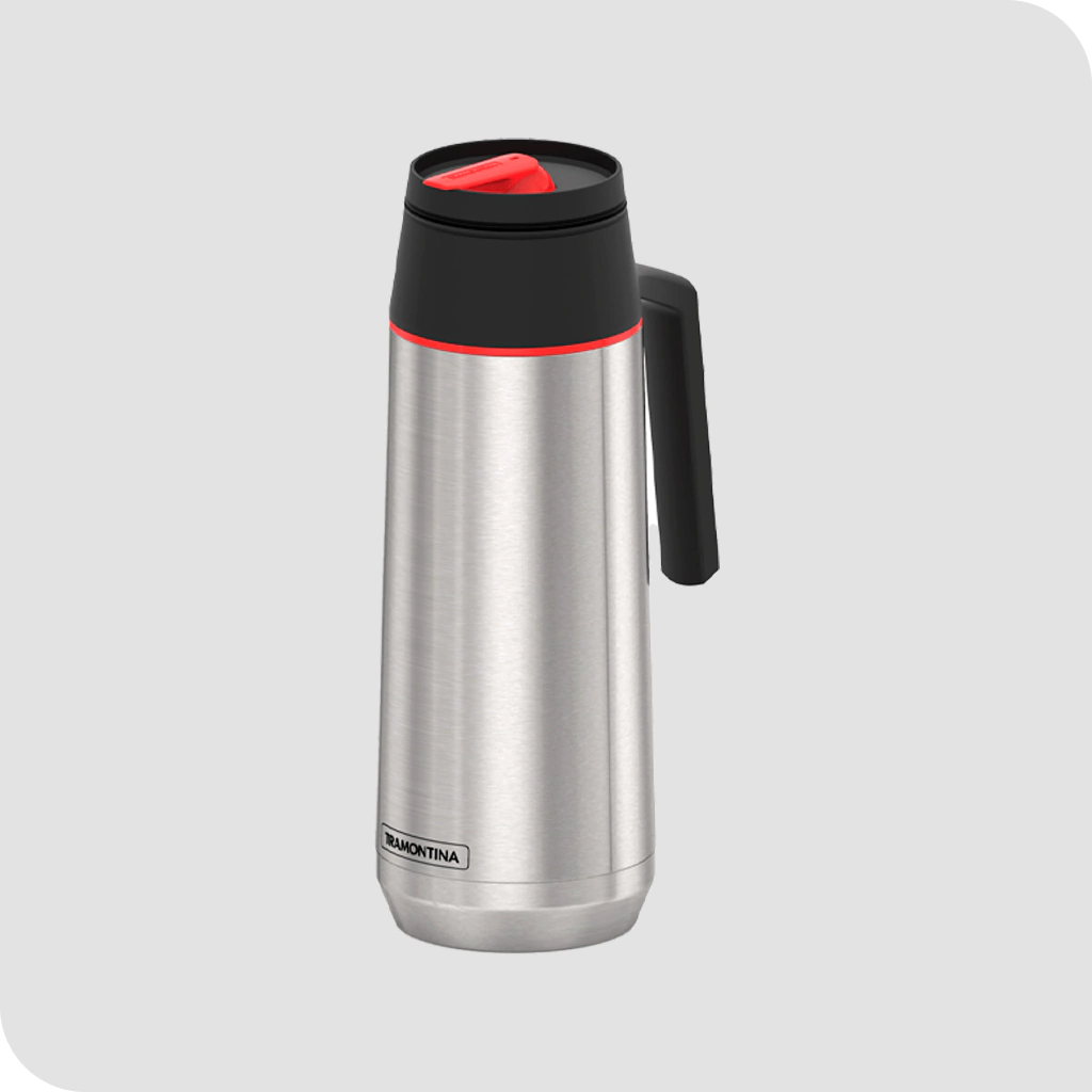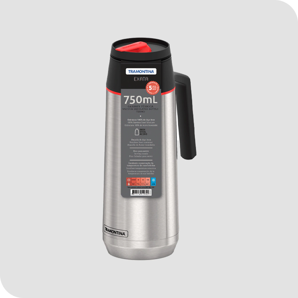 Termo TRAMONTINA de acero, su capacidad es de 750ml, con manija y pico cebador.