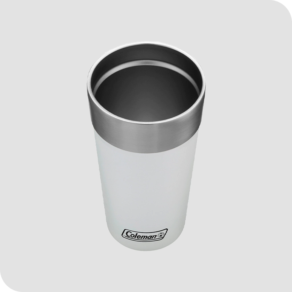 Vaso térmico COLEMAN brew, de acero inoxidable, con tapa de acrílico hermético con abertura corrediza. Posee una base con destapador integrado y borde de goma que permite apoyar con firmeza. Capacidad: 600ml.