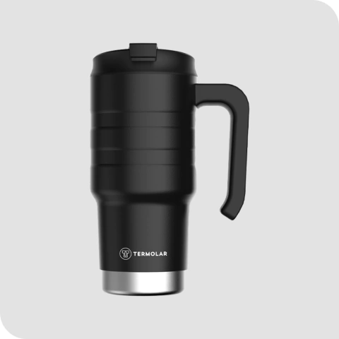 Vaso térmico TERMOLAR moove, de acero inoxidable, con tapa y manija. Capacidad: 590ml.